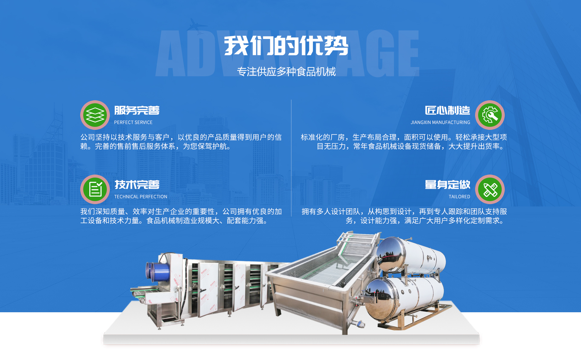 我们坚持不懈努力为客户提供好的食品机械和贴心的服务,从初的咨询、设计到安装、调试、培训,我们力争满足不同层次的客户需求。