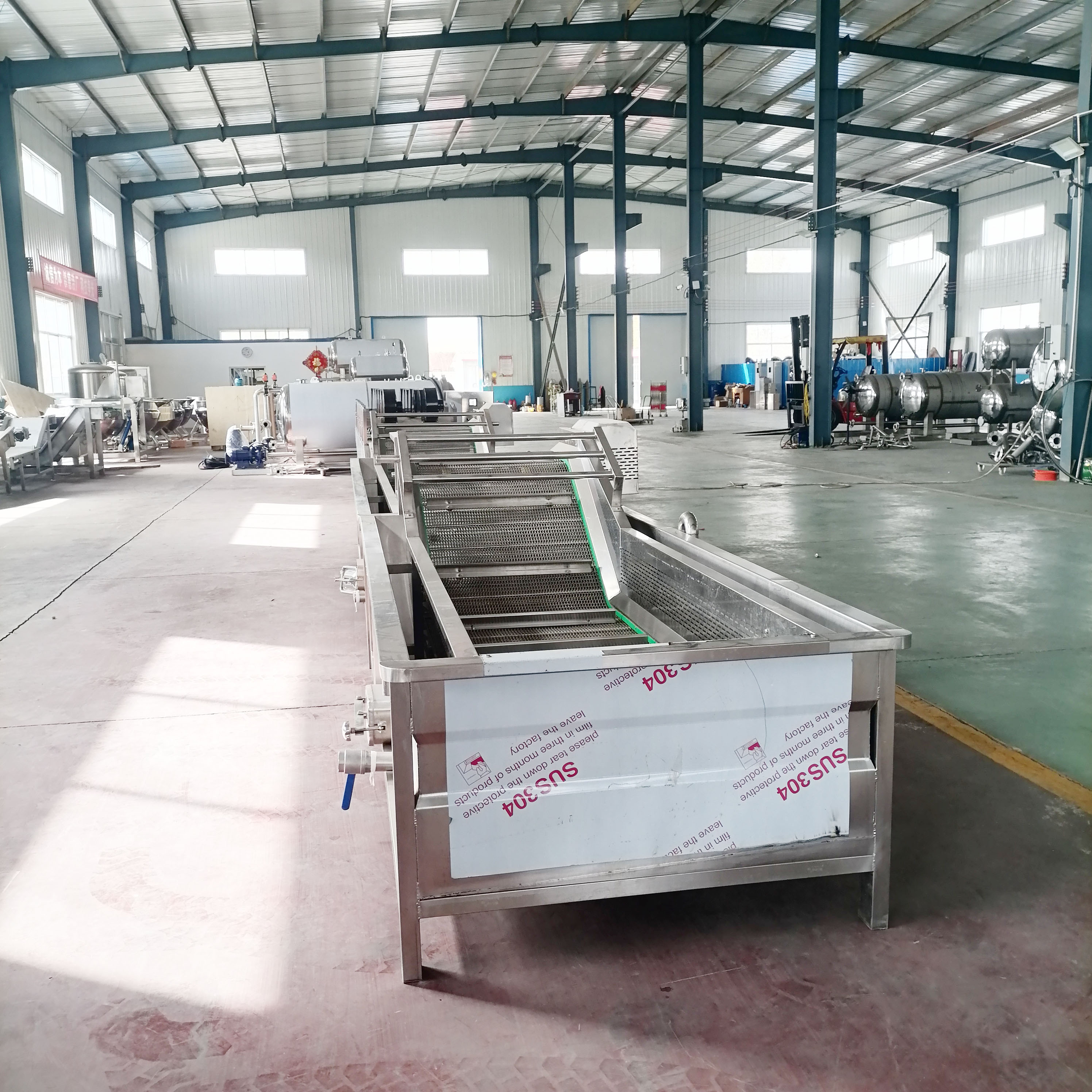 气泡清洗机是大枣,蔬菜,水产生产线中的重要产品,主要用于大枣,蔬菜,水产的清洗。气泡清洗机的原理主要是利用箱体前部分设备箱体中注适量的水,经过加热管将水温加热,原料在经过箱体时,会与气泡机和水的结合作用下做翻滚状态,并随网带不断向前推进,在出水面时,设有喷淋头,高压冲洗。